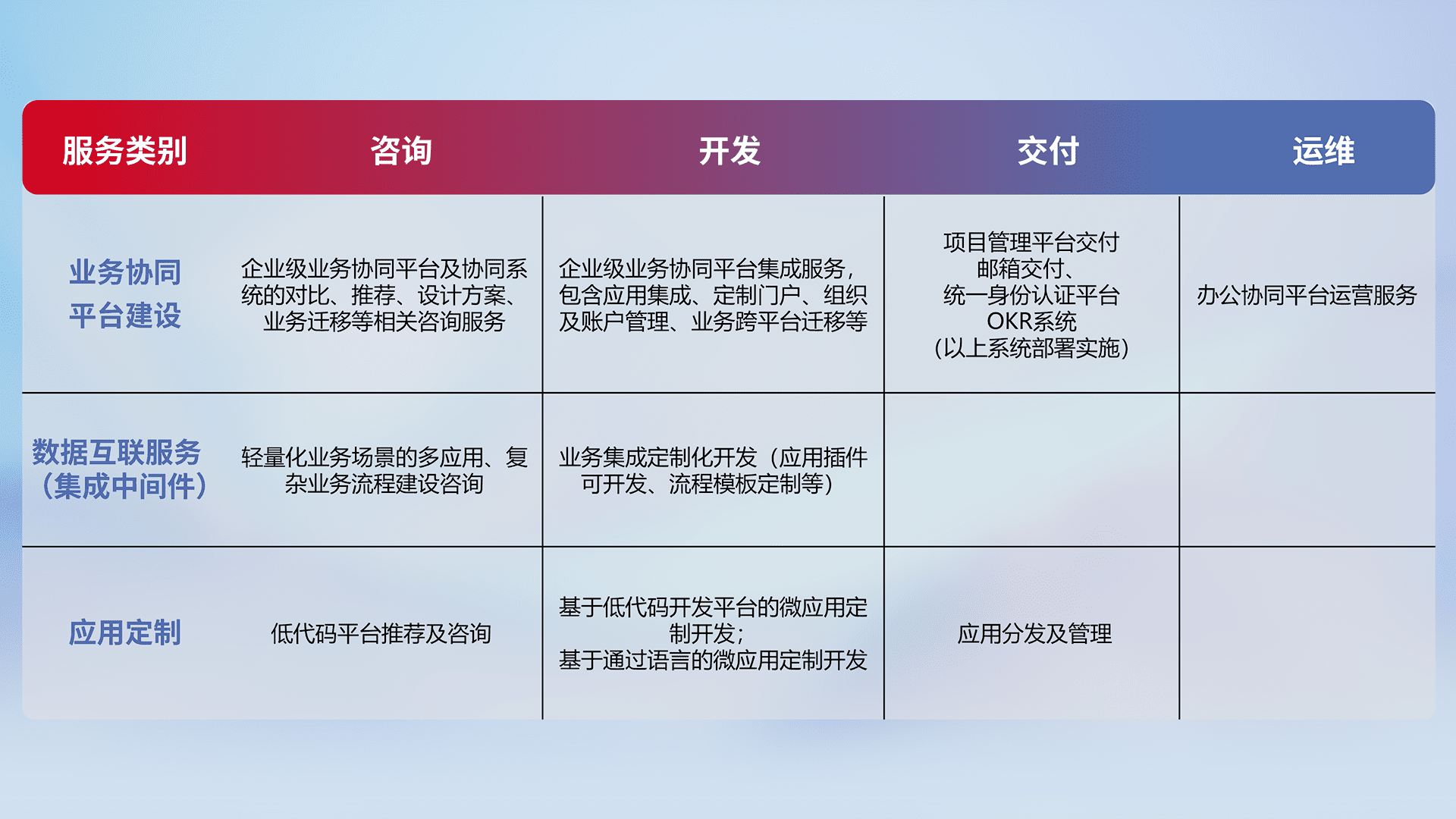 针对钉钉、、企微、、IDaas等平台级产品提供产品的规划、、、、方案、、、、交付、、、、定制化开发等服务,,,实现如统一协同办公、、、智能客户服务、、、混合会议管理、、智能数据查询、、等业务场景,,,,实现数字化转型。。