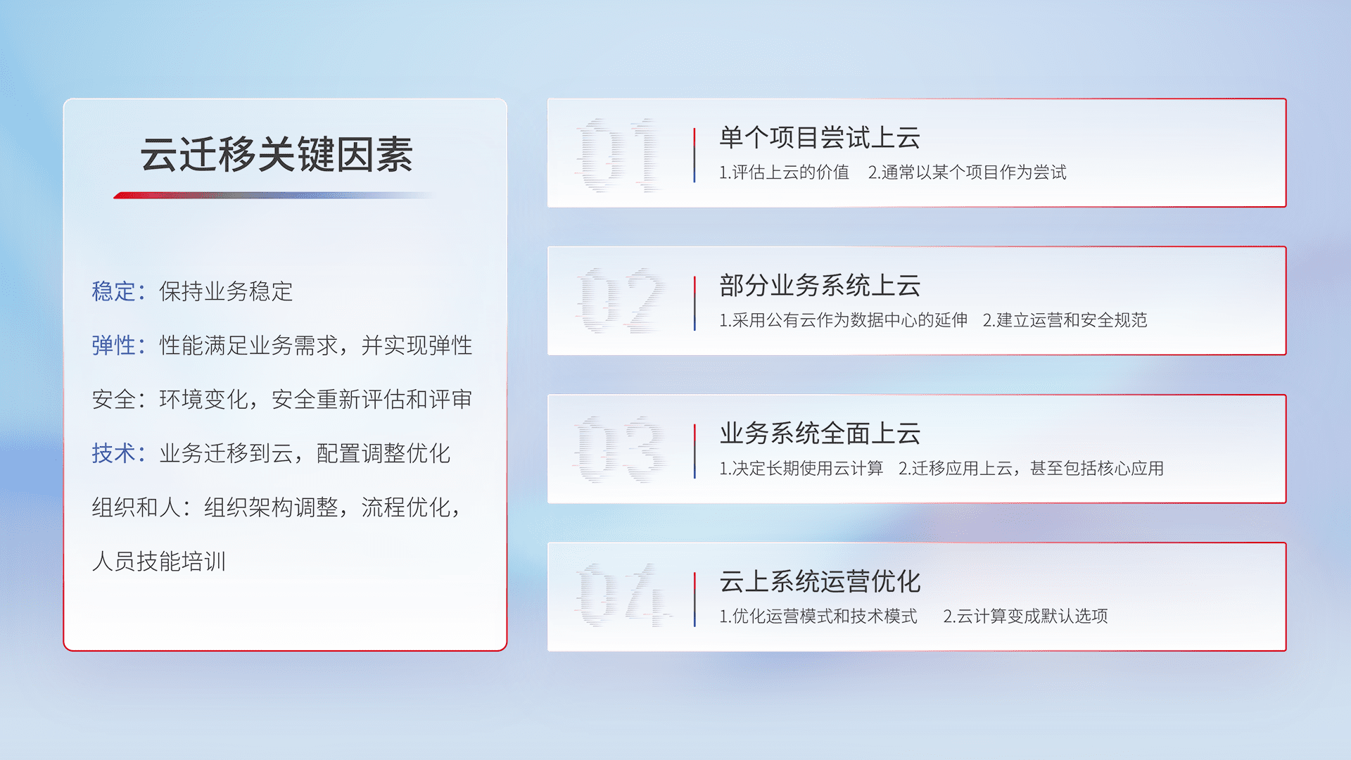 结合实际业务,,,,从规划设计、、、、云平台选型、、云原生改造、、、数据迁移、、、集成交付,,,,迁移全过程为客户识别最佳上云路径,,,做好风险识别管理,,设计网络架构、、、、身份权限、、安全审计合规、、、、操作审计、、、、日志审计、、、、监控告警策略、、、多站点容灾设计等,,,对云上基础设施进行整体规划,,,,提升IT治理水平,,,以满足弹性、、、、高可用、、、、高性能的需求。。